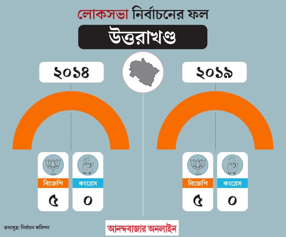 ২০১৯ সালের ভোটে দেশে বিজেপি একাই ৩০৩ আসন পেয়েছিল। এ বার তাদের ঘোষিত লক্ষ্য ছিল নিজেদের ঝুলিতে ৩৭০ আসন এনে এনডিএ-কে ৪০০ পার করানো। বিজেপির ‘প্রাণভোমরা’ লুকিয়ে হিন্দিবলয়ে। আরও স্পষ্ট করে বললে হিন্দিবলয়ের দশটি রাজ্যে— বিহার, ঝাড়খণ্ড, উত্তরপ্রদেশ, ছত্তীসগঢ়, মধ্যপ্রদেশ, দিল্লি, হরিয়ানা, রাজস্থান, হিমাচল প্রদেশ ও উত্তরাখণ্ড। এই বলয়ে রয়েছে লোকসভার ২২৫ আসন। দেশে সব মিলিয়ে ৫৪৩ আসনের মধ্যে সরকার গড়তে যেখানে ২৭২টি আসন লাগে, সেখানে শুধু হিন্দিবলয় থেকেই গত ভোটে এনডিএ জিতেছিল ২০৩ আসনে। আপাতদৃষ্টিতে মনে হতেই পারে, গোটা দেশের বিচারে উত্তরাখণ্ডের মতো মাত্র পাঁচটি আসনের ছোট রাজ্যের আর কতই বা গুরুত্ব? কিন্তু লক্ষ্য যেখানে ৪০০ টপকানো, সেখানে নিজেদের ‘শক্ত ঘাঁটি’তে একটি আসনেও হারা মানে বিরোধীদের ‘নৈতিক জয়’। তা ছাড়া, মোদীর সাধের চারধাম প্রকল্পের জন্যেও উত্তরাখণ্ড দখলে রাখা গুরুত্বপূর্ণ বলে মনে করে বিজেপি।