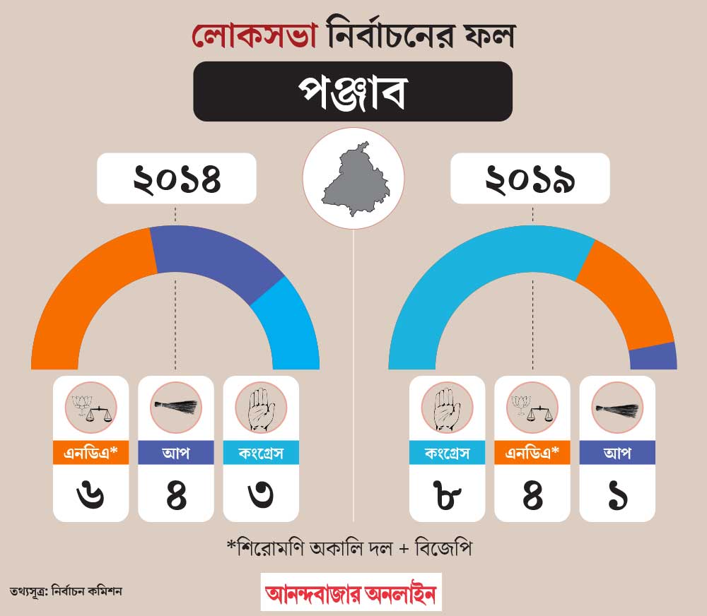 ২০২৪ সালের লোকসভা ভোটের ফলাফল বলছে, পঞ্জাব তার ১৩টি আসনের ৭টিই তুলে দিয়েছে কংগ্রেসের হাতে। শাসক আপকে দিয়েছে ৩টি আসন। বিজেপির সঙ্গ-ছাড়া শিরোমণি অকালি দল আসন পেয়েছে ১টি। এ ছাড়া জয়ী হয়েছেন দু’জন নির্দল প্রার্থী। কিন্তু বিজেপি একটি আসনও জেতেনি। তারা যে জিতবেও না, সেই ইঙ্গিত পঞ্জাবের হাওয়ায় ভাসছিল।