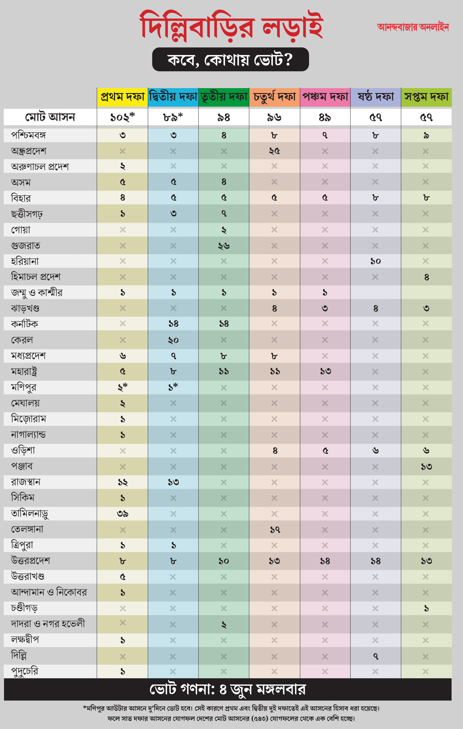কলকাতার দু’টি আসন, উত্তর কলকাতা এবং দক্ষিণ কলকাতায় ভোট হবে ১ জুন। ওই দিনই লোকসভা ভোটের সপ্তম তথা শেষ দফার ভোটগ্রহণ। পশ্চিমবঙ্গে অবশ্য মোট সাত দফায় ভোট হবে।