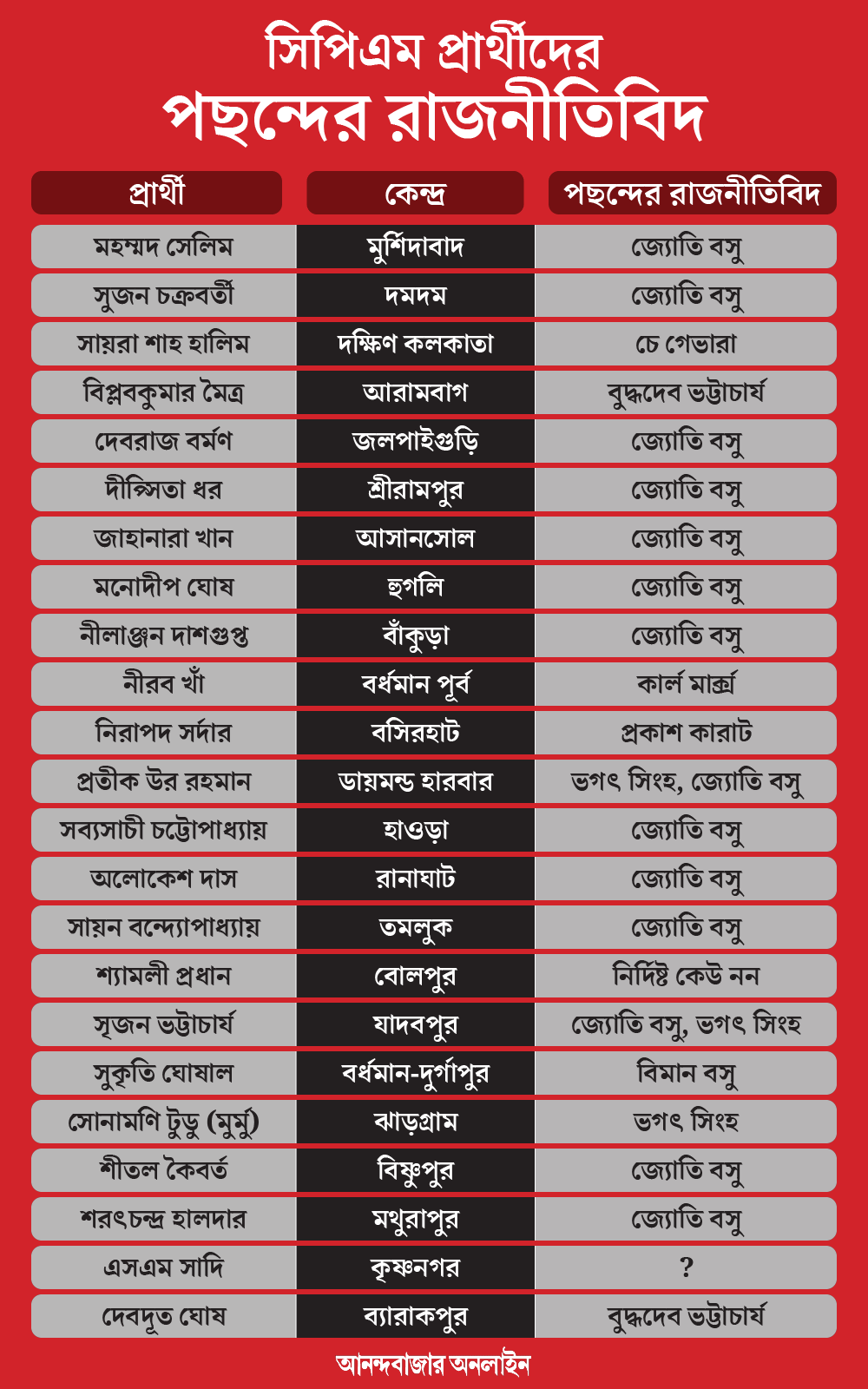 রাজ্য সিপিএমের ফেসবুক পেজ থেকে কয়েক সপ্তাহ ধরেই প্রার্থীদের পরিচিতিপত্র প্রকাশ করা হচ্ছিল। শনিবার সকাল পর্যন্ত ২২ জনের পরিচিতিপত্র প্রকাশিত হয়েছে। কৃষ্ণনগরের সিপিএম প্রার্থী এসএম সাদির পরিচিতিপত্র প্রকাশে ‘জটিলতা’ রয়েছে বলে খবর। তবে সে ‘জটিলতা’ একান্ত ভাবেই যোগাযোগ, সময়াভাব এবং প্রযুক্তিগত। যে ২২ জনের পছন্দের রাজনীতিকের তালিকা প্রকাশিত, তাতে দেখা যাচ্ছে ১৪ জনই বলেছেন, তাঁদের পছন্দের রাজনীতিবিদ জ্যোতি বসু। জ্যোতির সেই বলয়ের সামনে নিষ্প্রভ বুদ্ধদেব। মাত্র দু’জন প্রার্থী পছন্দের রাজনীতিকের তালিকায় রেখেছেন বুদ্ধদেবকে। আরামবাগের বিপ্লব মৈত্র এবং ব্যারাকপুরের অভিনেতা প্রার্থী দেবদূত ঘোষ।