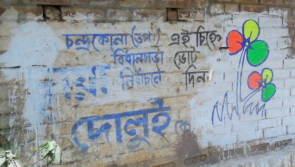 বাঁ হাতে ঝুলছে রঙের ডাব্বা। ডান হাতে তুলি। দেওয়াল লেখার কাজ শেষ। ‘আসন্ন বিধানসভা নির্বাচনে চন্দ্রকোনা বিধানসভার প্রার্থী ছায়া দোলুইকে ভোট দিন।’ পাশে ঘাসের উপর জোড়া ফুল প্রতীক।