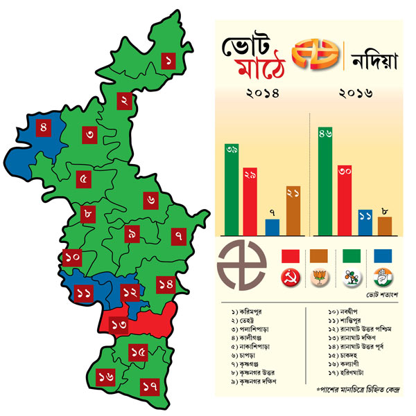 সিপিএম গত বার এক লপ্তে করিমপুর, তেহট্ট, পলাশিপাড়া জিতেছিল। এ বার এক দিকে মহুয়া মিত্র নামক বহিরাগত ঝড়, অন্য দিকে গৌরী দত্ত-তাপস সাহা আপৎকালীন গাঁটছড়ার কল্যাণে ওই তিন আসনই ছিনিয়ে নিয়েছে তৃণমূল।