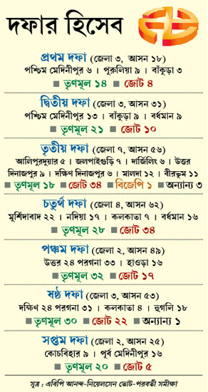 নিয়েলসেনের প্রাক-ভোট সমীক্ষায় বলা হয়েছিল বিজেপি পেতে পারে ৫ শতাংশ ভোট। জোটের নেতাদের মতে, ভোট যত এগিয়েছে মূল লড়াই হয়ে দাঁড়িয়েছে ‘হ্যাঁ দিদি’ বনাম ‘না দিদি’। সেই মেরুকরণটা যদি বাস্তব হয়, তা হলে ভোট চলাকালীন বিজেপির প্রাপ্ত ভোট ৫ থেকে বেড়ে ৭ শতাংশ হল কী ভাবে? এখানেই থেমে থাকেননি জোটের নেতারা। তাঁদের বক্তব্য, প্রতিটি দফায় পৃথক পৃথক ভাবে ফলাফলের যে সম্ভাবনার ছবি উঠে এসেছে সমীক্ষায়, তাতেও অসঙ্গতি রয়েছে। বিশেষ করে তৃতীয় দফার ভোটে, উত্তরবঙ্গে তৃণমূলের যে সম্ভাবনার কথা বলা হয়েছে তার সঙ্গে তাঁরা একমত নন। একই ভাবে পঞ্চম দফার ইঙ্গিত নিয়েও সন্দিহান জোট।