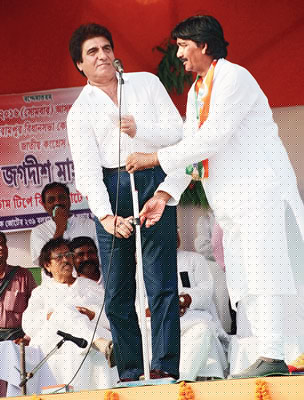 বলরামপুরে রাজ বব্বরের পাশে প্রার্থী জগদীশ মাহাতো। ছবি: প্রদীপ মাহাতো ও সুজিত মাহাতো