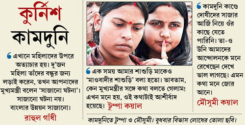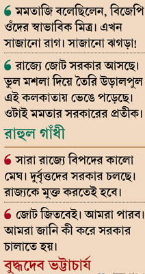 প্রাক্তন মুখ্যমন্ত্রীর কথার রেশ ধরেই এর পরে রাহুল বলেছেন, ‘‘রাজ্যে জোট সরকার আসছে। ভুল মশলা দিয়ে তৈরি উড়ালপুল এই কলকাতায় দড়াম করে ভেঙে পড়েছে! ওটাই মমতার সরকারের প্রতীক!’’ উড়ালপুলের মতোই তৃণমূলের সরকার ভেঙে পড়ার ভবিষ্যদ্বাণী করে রাহুলের আরও মন্তব্য, ‘‘মমতাজিকে বলছি, উড়ালপুল ভেঙে পড়া, চিটফান্ড কেলেঙ্কারি— এ সবের অনেক তদন্ত আপনি করেছেন! এ বার তদন্ত কংগ্রেস এবং বামফ্রন্টের জোট সরকারই করবে।’’ কংগ্রেস সহ-সভাপতির আশ্বাস, নতুন সরকার এসে রাজ্যে শিল্পায়ন এবং কর্মসংস্থানের উপরে বেশি জোর দেবে। একই কথা শোনা গিয়েছে বুদ্ধবাবুর মুখেও। রাজ্যের প্রাক্তন মুখ্যমন্ত্রী তৃণমূলের সঙ্গে বিজেপি-কে হঠানোর ডাক দিয়েছেন। তেমন রাহুলও এনডিএ জমানায় ‘বিজেপি আমাদের স্বাভাবিক মিত্র’ সংক্রান্ত মমতা বন্দ্যোপাধ্যায়ের পুরনো মন্তব্য উল্লেখ করে কটাক্ষ করেছেন, ‘‘মোদীজি (নরেন্দ্র) ও মমতাজি একে অপরকে আক্রমণ করছেন। এ সব সাজানো রাগ! সাজানো ঝগড়া!’’