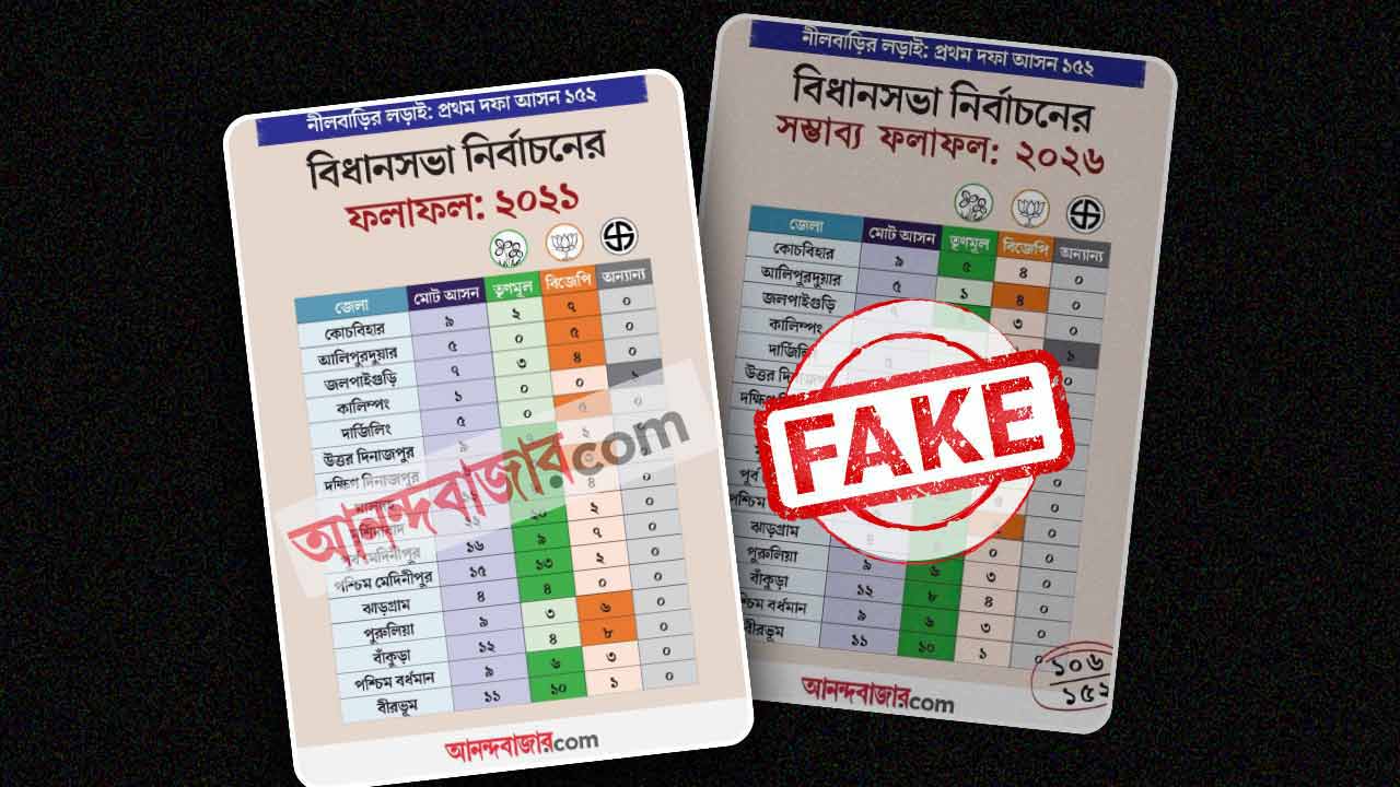 বিভিন্ন সূত্র মারফত ওই ভুয়ো কার্ডের স্ক্রিনশট (স্ক্রিনশটটি আমরা এই প্রতিবেদনের মূল ছবিতেও ব্যবহার করেছি) আমাদের কাছে এসেছে। আনন্দবাজার ডট কম সমাজমাধ্যমে যে ধরনের গ্রাফিক কার্ড (টেমপ্লেট) ব্যবহার করে, প্রচারিত স্ক্রিনশটটি হুবহু তারই আদলে তৈরি। আনন্দবাজার ডট কম-এর লোগোও রয়েছে তাতে। এমনটি হওয়ারই সম্ভাবনা প্রবল যে, আমাদের কোনও একটি টেমপ্লেটকে ফোটোশপ জাতীয় কোনও ডিজ়াইন সফ্টঅয়্যারে ফেলে তার পরিবর্তন করা হয়েছে। ভাইরাল স্ক্রিনশটে যে শিরোনাম রয়েছে, তা হল, ‘বিধানসভা নির্বাচনের সম্ভাব্য ফল: ২০২৬’। তার উপরে তুলনায় ছোট হরফে লেখা হয়েছে ‘নীলবাড়ির লড়াই: প্রথম দফা আসন ১৫২’।