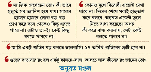 নিজেকে জাদুকর বলে দাবি করছেন অনুব্রত মণ্ডল। বলছেন ‘‘ম্যাজিক দেখেছেন তো? কী ভাবে মুহূর্তে সব ভ্যানিশ হয়ে যায়! সামনে হাজার হাজার লোক বড়-বড় চোখ করে বসে থেকেও কিছু ধরতে পারে না। এটাও তাই। কেউ কিছু ধরতে পারবে না। সিপিএমের আমলেও তেমনই হতো।’’