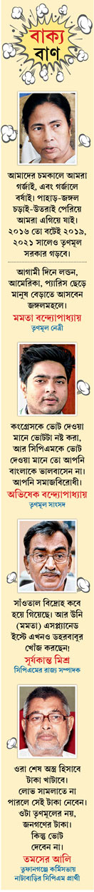 কংগ্রেস নেতা শঙ্কর মালাকারের কটাক্ষ, ‘‘গৌতমবাবুরা বুঝেছেন, কংগ্রেসের ভোট ছাড়া তাঁদের জয় সম্ভব নয়। তাই এখন কংগ্রেসকে বামেদের পাশে দেখে হাতে বাঁশ-বোমা তুলে নিচ্ছে তৃণমূল।’’ তবে গৌতমবাবু ও আলিপুরদুয়ারের জেলা তৃণমূল সভাপতি সৌরভ চক্রবর্তীর কথায়, ‘‘নীতি-আর্দশ ভুলে জোট করায় মানুষের সাড়া মেলেনি। তাই বাম-কংগ্রেস মিথ্যের আশ্রয় নিচ্ছে।’’