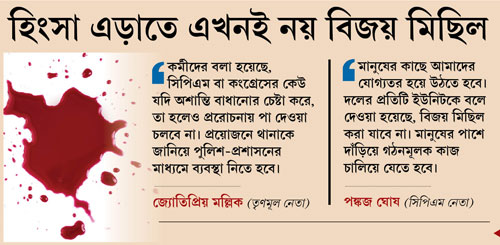 সিপিএমও কর্মী-সমর্থকদের বিজয় মিছিল না করার নির্দেশ দিয়েছে। সিপিএমের জেলা সম্পাদকমণ্ডলীর সদস্য পঙ্কজ ঘোষ বলেন, ‘‘মানুষের কাছে আমাদের যোগ্যতর করে তুলতে হবে। দলের প্রতিটি ইউনিটকে জানিয়ে দেওয়া হয়েছে, বিজয় মিছিল করা যাবে না। কর্মীদের বলা হয়েছে মানুষের পাশে দাঁড়িয়ে গঠনমূলক কাজ করে যেতে হবে।’’ তাঁর কথায়, ‘‘আক্রমণ হলে ধৈর্য্যের সঙ্গে পুলিশ-প্রশাসনকে সঙ্গে নিয়ে তার প্রতিবাদ করা হবে।’’