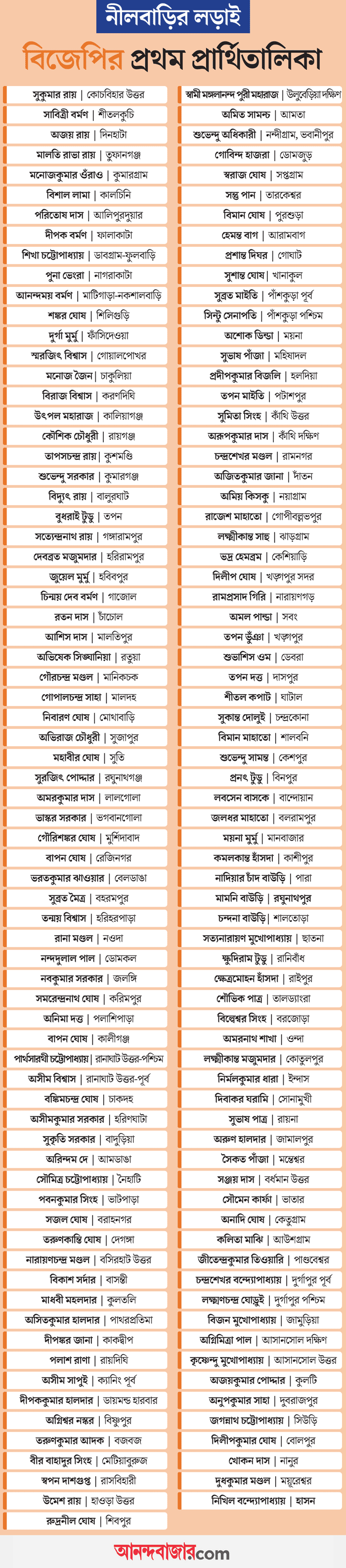 ২৯৪টির মধ্যে ১৪৪টি আসনের জন্য সোমবার প্রার্থী ঘোষণা করেছে বিজেপি। যে আটটি জেতা আসনে প্রার্থী বদল হয়েছে, তার মধ্যে তিনটি উত্তরবঙ্গে, তিনটি রাঢ়বঙ্গে, বাকি দু’টি রাঢ় ঘেঁষা দক্ষিণবঙ্গে। সবচেয়ে বড় চমক দক্ষিণ দিনাজপুরের বালুরঘাটে!