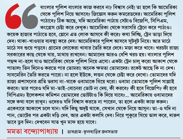 ২০১৩ সালে পঞ্চায়েত ভোট, পরের বছর লোকসভা নির্বাচনের সময় দেখা গিয়েছে, সুষ্ঠু অবাধ ভোট করতে চাওয়া কমিশনকে বিরোধী পক্ষ ঠাউরে নেন তৃণমূল নেত্রী। এ বারও বাংলার ভোটমঞ্চে একই দৃশ্য। নিরপেক্ষ ভোট করাতে নেমে সদ্য বৃহস্পতিবারই কমিশন এক লপ্তে ৩৭ জন অফিসারকে বদলি করেছে। তার পর ২৪ ঘণ্টাও কাটেনি, মমতা বন্দ্যোপাধ্যায়ের আক্রমণের নিশানায় তারা। শুক্রবার ডাবগ্রাম-ফুলবাড়ির সভায় দাঁড়িয়ে তিনি বলেন, ‘‘নির্বাচন কমিশন পাঠিয়ে দিল্লি আমাকে অপমান করেছে।’’ এবং কমিশনের সিদ্ধান্তকে কার্যত চ্যালেঞ্জ করেন, ‘‘পুলিশকে বদলি করে কোনও লাভ নেই। যাঁকে তাদের জায়গায় দেবেন, তাঁরাও তো আমাদেরই লোক!’’