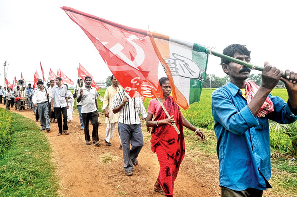 |একই লাঠিতে উড়ছে হাত-কাস্তে। আরামবাগের পুইন এলাকায় জোটের মিছিল। ছবি: মোহন দাস।