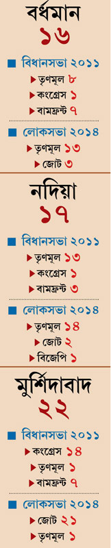 এমনিতেই দুর্বল। কংগ্রেসের দুর্গে দাপিয়ে ভোট করে যত বেশি সম্ভব আসন ঘরে তুলতে চাইবে জোট শিবির। আবার জোটের প্রভাবে নদিয়ার বেশ কিছু আসনেও শাসক দলের অবস্থা নড়বড়ে।