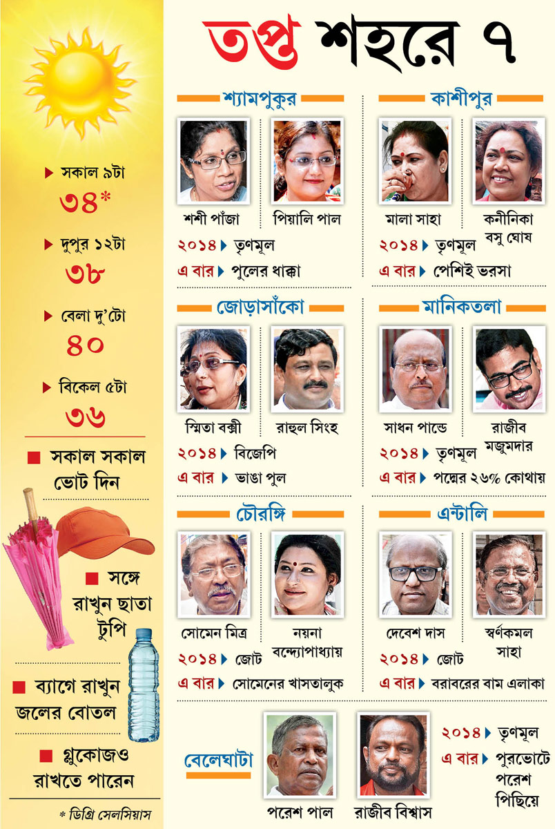 আজ ভোট দুপুরে কলকাতায় পারদের মাত্রা ৪১ ডিগ্রি সেলসিয়াস ছোঁবে বলে আভাস দিয়েছে আলিপুর হাওয়া অফিস। আর রাজনীতির আবহাওয়াবিদরা বলছেন, তাঁদের তল্লাটে পারদ চড়বে আরও বেশ কয়েক ডিগ্রি। কারণ, ভোট যত এগোচ্ছে, আশঙ্কা চেপে বসছে শাসক শিবিরে। আর চাঙ্গা হচ্ছে বিরোধী জোট। মরিয়া হয়ে এক পক্ষের আক্রমণ এবং অন্য পক্ষের প্রতিরোধ বাড়ছে।