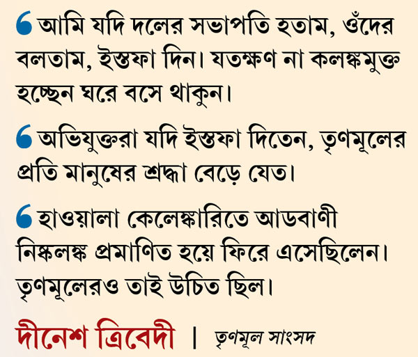 উত্তরে দীনেশের বক্তব্য, ঘুষ-কাণ্ডে নৈতিক দায়িত্ব নিয়ে অভিযুক্তরা ইস্তফা দিলে তৃণমূলের প্রতি মানুষের শ্রদ্ধা বেড়ে যেত। বিধানসভা ভোটেও দলের লাভ হতো। তিনি বলেন, ‘‘হাওয়ালা কেলেঙ্কারিতে নাম জড়ানোর পরে লালকৃষ্ণ আডবাণী ইস্তফা দিয়ে যে দৃষ্টান্ত রেখেছিলেন, সেটাই সময়ের দাবি। আডবাণী পদ আঁকড়ে থাকেননি। নিষ্কলঙ্ক প্রমাণিত হয়ে তবেই ফিরে এসেছিলেন। তৃণমূলেরও সেটা করা উচিত ছিল।’’