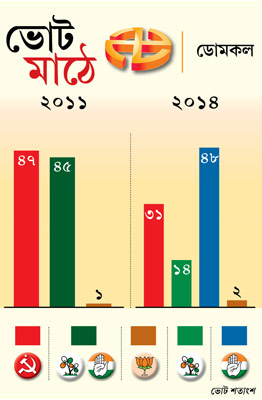 সীমান্ত উজিয়ে গ্রামগুলিতে ঢুকে পড়েছেন পড়শি দেশের ‘জামাই’রাও। ভোটটা প্রতি বার তারাই নিয়ন্ত্রণ করে। কংগ্রেসর এক নেতা বলছেন, ‘‘ওই এলাকায় জামাইদের নিয়ন্ত্রণ করে ক্ষমতায় যারা থাকে তারাই। এ বার সেই বার নিয়েছে তৃণূল।’’ যা শুনে তৃণমূল অবশ্য হাসছে। স্থানীয় নেতারা বলছেন, ‘‘আমাদের জামাইদের সঙ্গে ওঠাবসা নেই। ও সব কাজ বিরোধীদের।’’ তবে ঘরপোড়া গরুর মতোই সিঁদুরে মেঘ দেখছেন ডোমকলের আম জনতা। কঠিন এই লড়াই এর মধ্যে দিয়ে কি আবার ডোমকল ফিরবে ডোমকলেই?