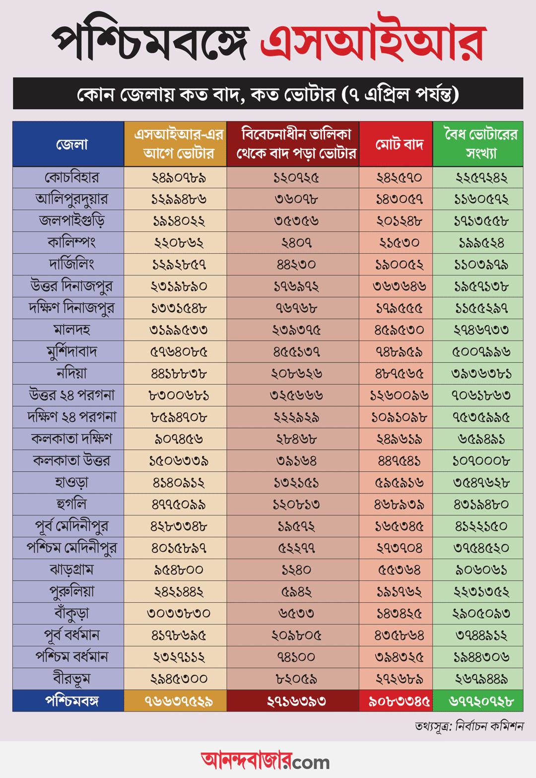 মালদহে বিবেচনাধীন তালিকা থেকে বাদ পড়েছে ২ লক্ষ ৩৯ হাজার ৩৭৫ জনের নাম। ২৮ ফেব্রুয়ারির তালিকা ধরলে এই জেলা থেকে বাদ গেল ৪ লক্ষ ৫৯ হাজার ৫৩০ জনের নাম। দুই তালিকা মিলিয়ে দক্ষিণ ২৪ পরগনায় বাদ গিয়েছে ১০ লক্ষ ৯১ হাজার ৯৮ জনের নাম। পূর্ব মেদিনীপুরে মোট বাদ পড়া ভোটারের সংখ্যা ১ লক্ষ ৬৫ হাজার ৩৪৫। কলকাতা জেলা থেকে বাদ গিয়েছে ৬ লক্ষ ৯৭ হাজার ১৬০ জন ভোটারের নাম।