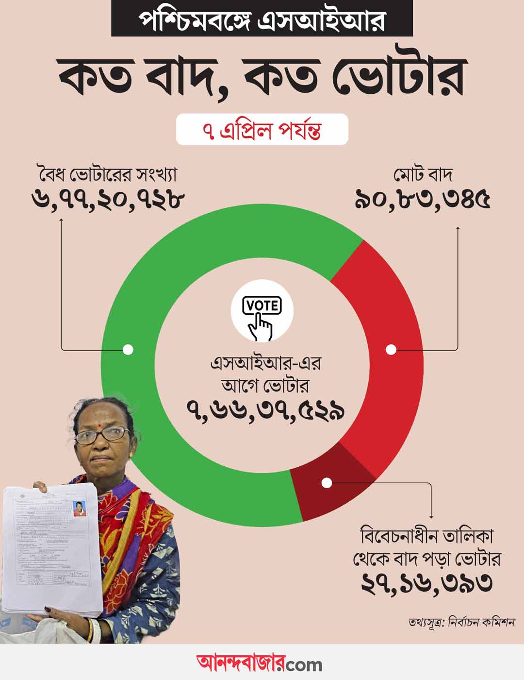 বিবেচনাধীন (আন্ডার অ্যাডজুডিকেশন) তালিকায় থাকা প্রায় ৬০ লক্ষ ভোটারের মধ্যে বাদ পড়ল ২৭ লক্ষ ১৬ হাজার ৩৯৩ জনের নাম। সোমবার গভীর রাতে কমিশন জেলা ধরে ধরে নাম বাদ পড়ার হিসাব প্রকাশ করেছে। গত ২৮ ফেব্রুয়ারি রাজ্যের প্রথম চূড়ান্ত ভোটার তালিকা প্রকাশের পর দেখা গিয়েছিল, বাদ গিয়েছে ৬৩ লক্ষ ৬৬ হাজার ৯৫২ জনের নাম। অর্থাৎ, ৭ এপ্রিল পর্যন্ত মোট ৯০ লক্ষ ৮৩ হাজার ৩৪৫ জন ভোটারের নাম বাদ পড়ল।
