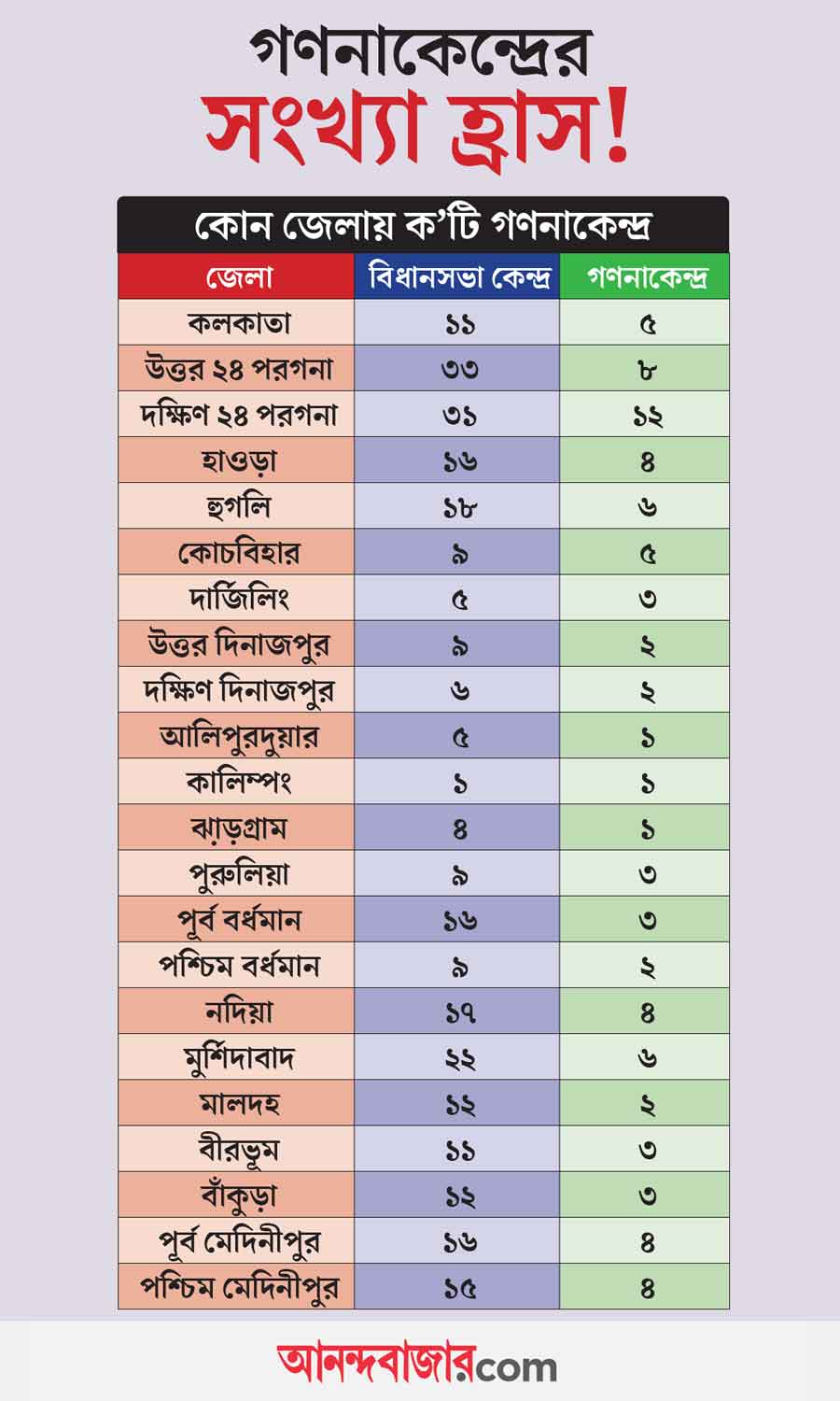 এ ছাড়া, কোচবিহারের ন’টি আসনের গণনা পাঁচটি কেন্দ্রে, দার্জিলিঙের পাঁচটি আসনের গণনা তিনটি কেন্দ্রে, উত্তর দিনাজপুরের ন’টি আসনের গণনা দু’টি কেন্দ্রে, দক্ষিণ দিনাজপুরে ছ’টি আসনের গণনা দু’টি কেন্দ্রে, মালদহের ১২টি আসনের গণনা দু’টি কেন্দ্রে, মুর্শিদাবাদের ২২টি আসনের গণনা ছ’টি কেন্দ্রে, নদিয়ার ১৭টি আসনের গণনা চারটি কেন্দ্রে, হাওড়ার ১৬টি আসনের গণনা চারটি কেন্দ্রে, হুগলির ১৮টি আসনের গণনা ছ’টি কেন্দ্রে, পূর্ব মেদিনীপুরের ১৬টি আসনের গণনা চারটি কেন্দ্রে, পশ্চিম মেদিনীপুরের ১৫টি আসনের গণনা চারটি কেন্দ্রে, পুরুলিয়ার ন’টি আসনের গণনা তিনটি কেন্দ্রে, বাঁকুড়ার ১২টি আসনের গণনা তিনটি কেন্দ্রে, পূর্ব বর্ধমানের ১৬টি আসনের গণনা তিনটি কেন্দ্রে, পশ্চিম বর্ধমানের ন’টি আসনের গণনা দু’টি কেন্দ্রে এবং বীরভূমের ১১টি আসনের গণনা তিনটে কেন্দ্রে হবে।