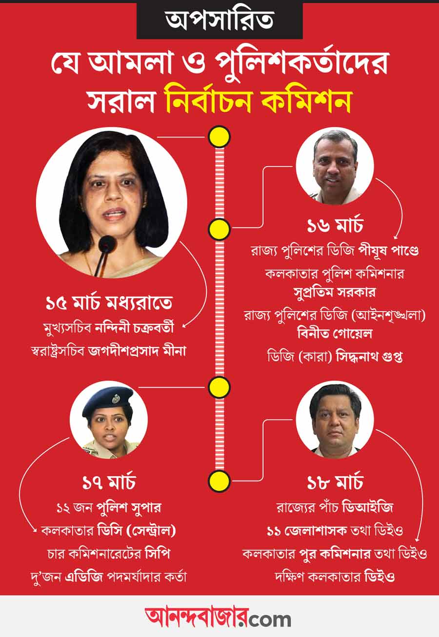 বুধবার প্রথমে রাজ্যের পাঁচ ডিআইজি-কে অপসারণের নির্দেশিকা জারি করেছিল কমিশন। রায়গঞ্জ রেঞ্জ, মুর্শিদাবাদ, বর্ধমান, জলপাইগুড়ি এবং প্রেসিডেন্সি রেঞ্জের ডিআইজি পদে নতুন আধিকারিকদের আনা হয়েছে। সোমবার রাজ্য পুলিশের ডিজি পীযূষ পাণ্ডেকে সরিয়ে দিয়েছিল নির্বাচন কমিশন। বদল করা হয়েছিল কলকাতার পুলিশ কমিশনার পদেও। তার ২৪ ঘণ্টা কাটতে না-কাটতে মঙ্গলবার একধাক্কায় রাজ্যের ১২ জন পুলিশ সুপারকে বদলে দেয় কমিশন। সরানো হয় কলকাতার ডিসি (সেন্ট্রাল) ইন্দিরা মুখোপাধ্যায়কেও। এ ছাড়া চার পুলিশ কমিশনারেটের কমিশনার, এডিজি পদমর্যাদার দু’জন কর্তাকেও সরিয়ে দেয় কমিশন।