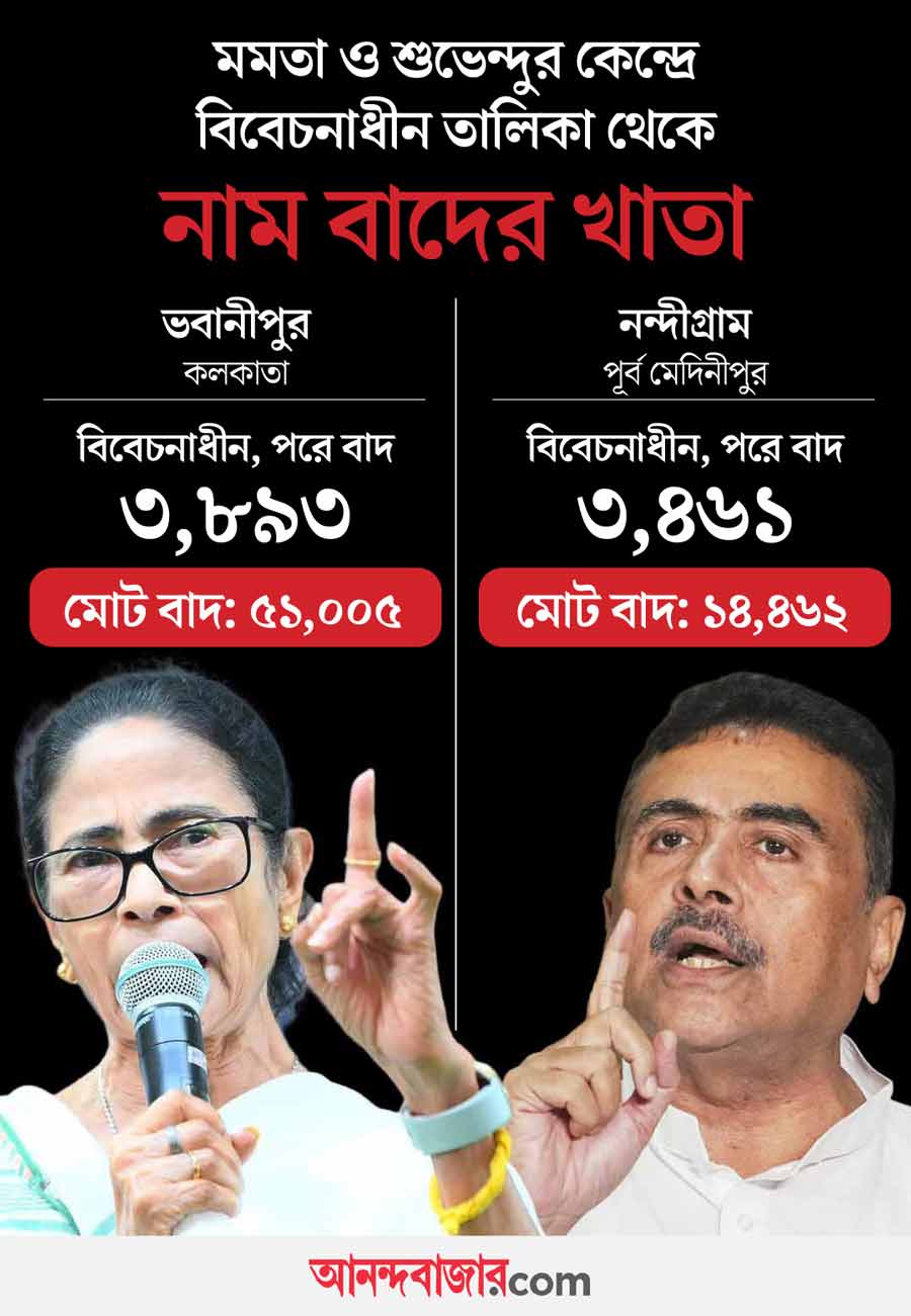 মুখ্যমন্ত্রী মমতা বন্দ্যোপাধ্যায়ের কেন্দ্র ভবানীপুর থেকেও বিবেচনাধীন অনেক নাম বাদ গিয়েছে। কমিশনের হিসাব অনুযায়ী, ৩,৮৯৩ জনের নাম মমতার কেন্দ্র থেকে বাদ পড়েছে বিবেচনার পর। মোট বাদ পড়া নামের সংখ্যা ৫১ হাজার ৫ জন। বিরোধী দলনেতা শুভেন্দু অধিকারীর কেন্দ্র নন্দীগ্রামে বিবেচনাধীন ৩,৪৬১ জনের নাম বাদ গিয়েছে। সেখানে মোট বাদ পড়েছে ১৪,৪৬২ জনের নাম।