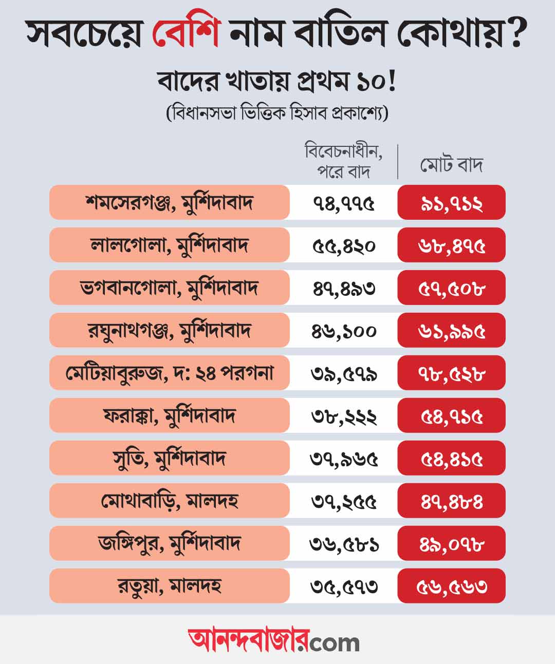 দক্ষিণ ২৪ পরগনার মেটিয়াবুরুজে বিবেচনাধীন তালিকা থেকে ৩৯,৫৭৯টি নাম বাদ গিয়েছে। এর ফলে সেখানে মোট বাদ পড়েছে ৭৮,৫২৮ জনের নাম। মালদহের মোথাবাড়িতে ৩৭,২৫৫টি এবং রতুয়ায় ৩৫,৫৭৩টি নাম বাদ গিয়েছে বিবেচনাধীন তালিকা থেকে। এই দুই কেন্দ্রে মোট বাদ পড়েছে যথাক্রমে ৪৭ হাজার এবং ৫৬ হাজার নাম।