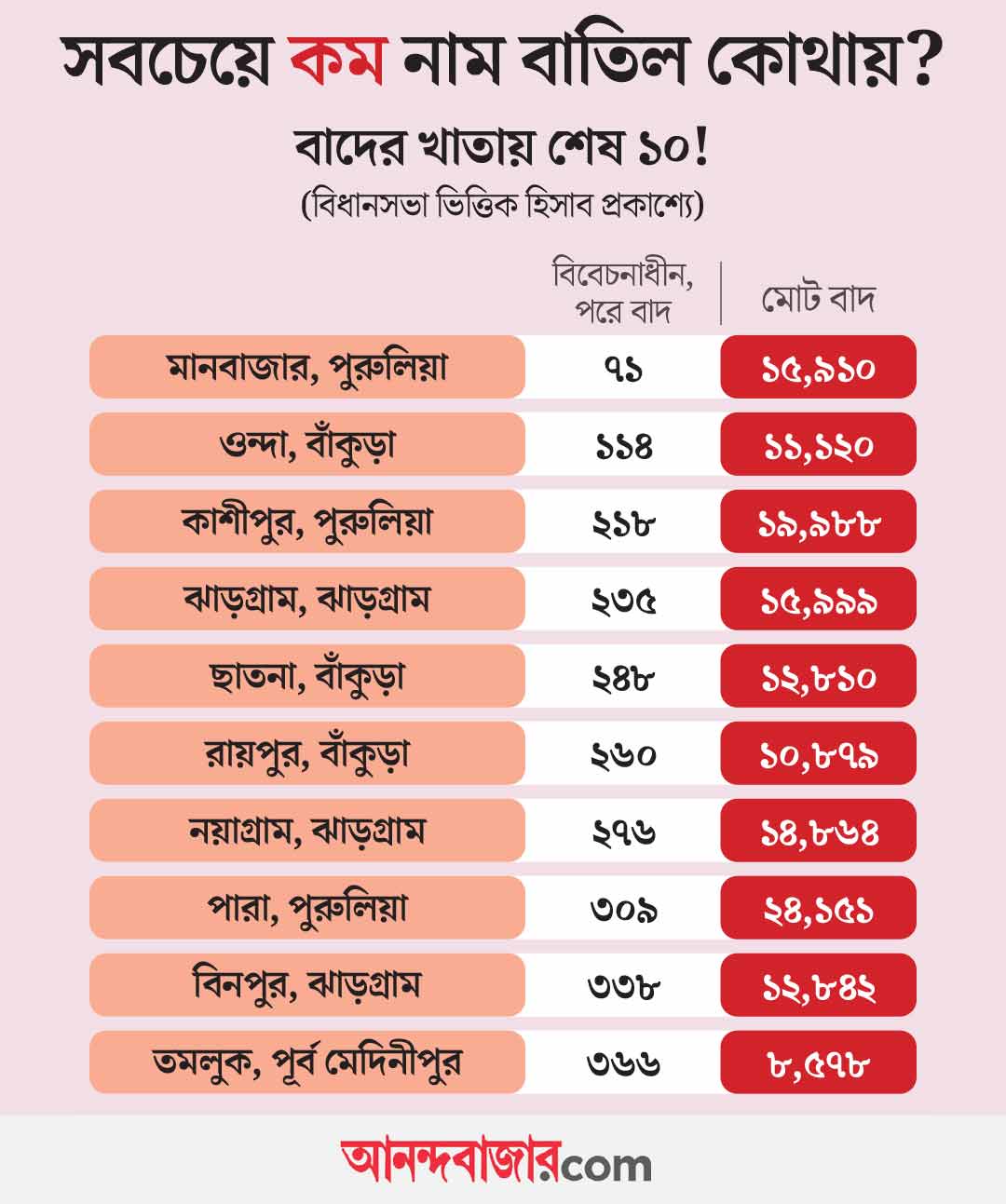 পুরুলিয়া, ঝাড়গ্রাম, বাঁকুড়ার মতো জেলাগুলিতে বিধানসভা কেন্দ্রের বিচারে বিবেচনাধীন তালিকা থেকে বাদ পড়া নামের সংখ্যা সবচেয়ে কম। পুরুলিয়ার মানবাজার বাদের তালিকার একেবারে শেষে রয়েছে। বিবেচনাধীন তালিকা থেকে সেখানে বাদ গিয়েছে মাত্র ৭১টি নাম। মোট বাদ পড়েছে ১৫,৯১০ জনের নাম।