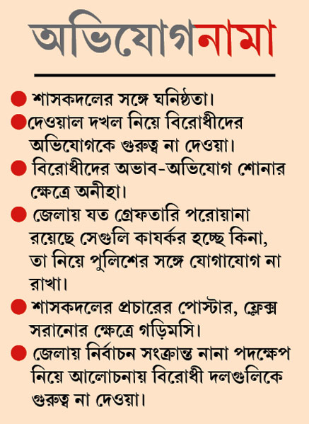 বস্তুত, নির্বাচনী বিধি লাগু হওয়ার পর জেলার ১৮টি বিধানসভা এলাকা থেকেই শাসকদলের বিরুদ্ধে কমবেশি নানা অভিযোগ উঠছিল। তার মধ্যে মারধর, দেওয়াল দখল, বাইক-বাহিনীর দাপট, প্রচারে বাধা তো ছিলই। কিন্তু সেই সব অভিযোগের সাপেক্ষে জেলা নির্বাচনী অফিসার হিসেবে ‘মুখ্যমন্ত্রী ঘনিষ্ঠ’ জেলাশাসককে সে ভাবে ভূমিকা পালন করতে দেখা যাচ্ছিল না বলে অভিযোগ তুলেছিলেন বিরোধীরা। গত কয়েকদিন ধরে সিপিএমের তারকেশ্বর জোনাল কার্যালয়ের সামনে দিয়ে শাসকদলের বাইক-বাহিনী টহল দিচ্ছিল। তাতে আতঙ্কিত দলীয় কর্মী-সমর্থকেরা নির্বাচনের কাজে নামতে ভয় পাচ্ছিলেন বলে জেলা সিপিএম নেতৃত্বের অভিযোগ। এ ব্যাপারে চলতি মাসের ৯, ১০ এবং ১২ তারিখে পর পর অভিযোগ জানানো হয় জেলাশাসকের দফতরে। কিন্তু সেই অভিযোগের কোনও সুরাহা হয়নি বলে সিপিএমের দাবি। একই ভাবে সিপিএমের ‘সিঙ্গুর থেকে শালবনি পদযাত্রা’র পর গোঘাটে তাদের কর্মীদের মারধরের ঘটনা বেড়ে গিয়েছিল বলেও অভিযোগ। বিরোধীরা এ সব নিয়ে নির্বাচন কমিশনেও অভিযোগ জানান। তার পরিণতিতেই জেলাশাসককে সরানো হল বলে রাজনৈতিক শিবিরের অভিমত।
