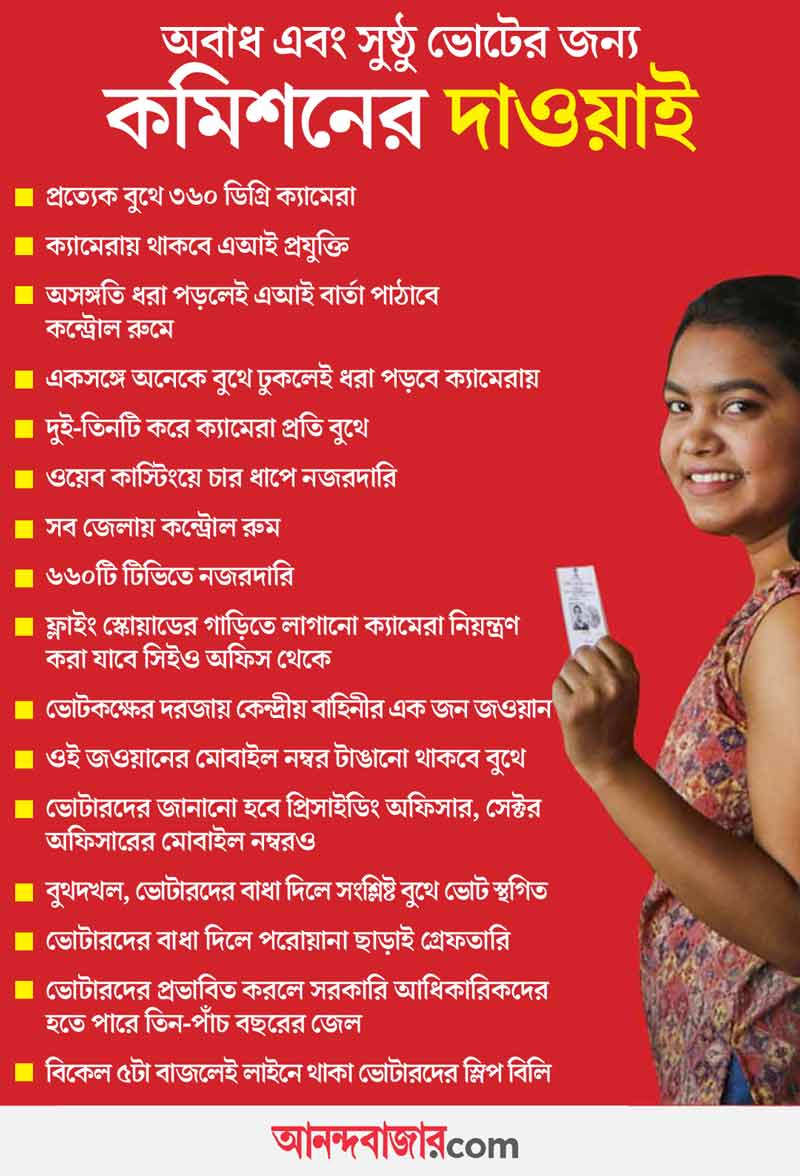 কমিশন আরও জানিয়েছে, কোথাও বুথদখল বা ভোটারদের হুমকি, ভোটদানে বাধা দেওয়া হয়েছে বলে কমিশন মনে করলে, সেখানে ভোটপর্ব বাতিল করে পুনর্নির্বাচন করানো হবে। সরকারি আধিকারিকেরাও কেউ ভোটারদের প্রভাবিত করার চেষ্টা করলে কড়া পদক্ষেপের হুঁশিয়ারি দিয়েছে কমিশন। এ ক্ষেত্রে তিন-পাঁচ বছরের জেল এবং জরিমানা হতে পারে তাঁদের। কমিশন এ-ও জানিয়ে দিয়েছে, এ বার আধাসেনা এবং পুলিশকে সক্রিয় ভাবে কাজ করার নির্দেশ দেওয়া হয়েছে এবং কোন ক্ষেত্রে কী পদক্ষেপ করতে হবে, তা নিয়ে কেন্দ্রীয় বাহিনীর জওয়ানদের প্রয়োজনীয় প্রশিক্ষণও দেওয়া হচ্ছে। কমিশনের ভাষায়, “কেউ যদি গোলমাল পাকানোর চেষ্টা করেন, তিনি নিজ দায়িত্বে সব কিছু করবেন। কারণ পুলিশ এবং আধাসেনাকে সক্রিয় ভাবে কাজ করতে নির্দেশ দেওয়া হয়েছে।”