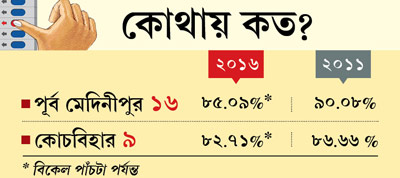 পূর্ব মেদিনীপুরে ১৬-০ করে দেওয়ার প্রত্যয় দেখিয়েছিলেন শুভেন্দু অধিকারী। ভুতুড়ে ভোট পড়ার কিছু অভিযোগ উঠলেও মোটের উপরে খুশি বিরোধীরা।