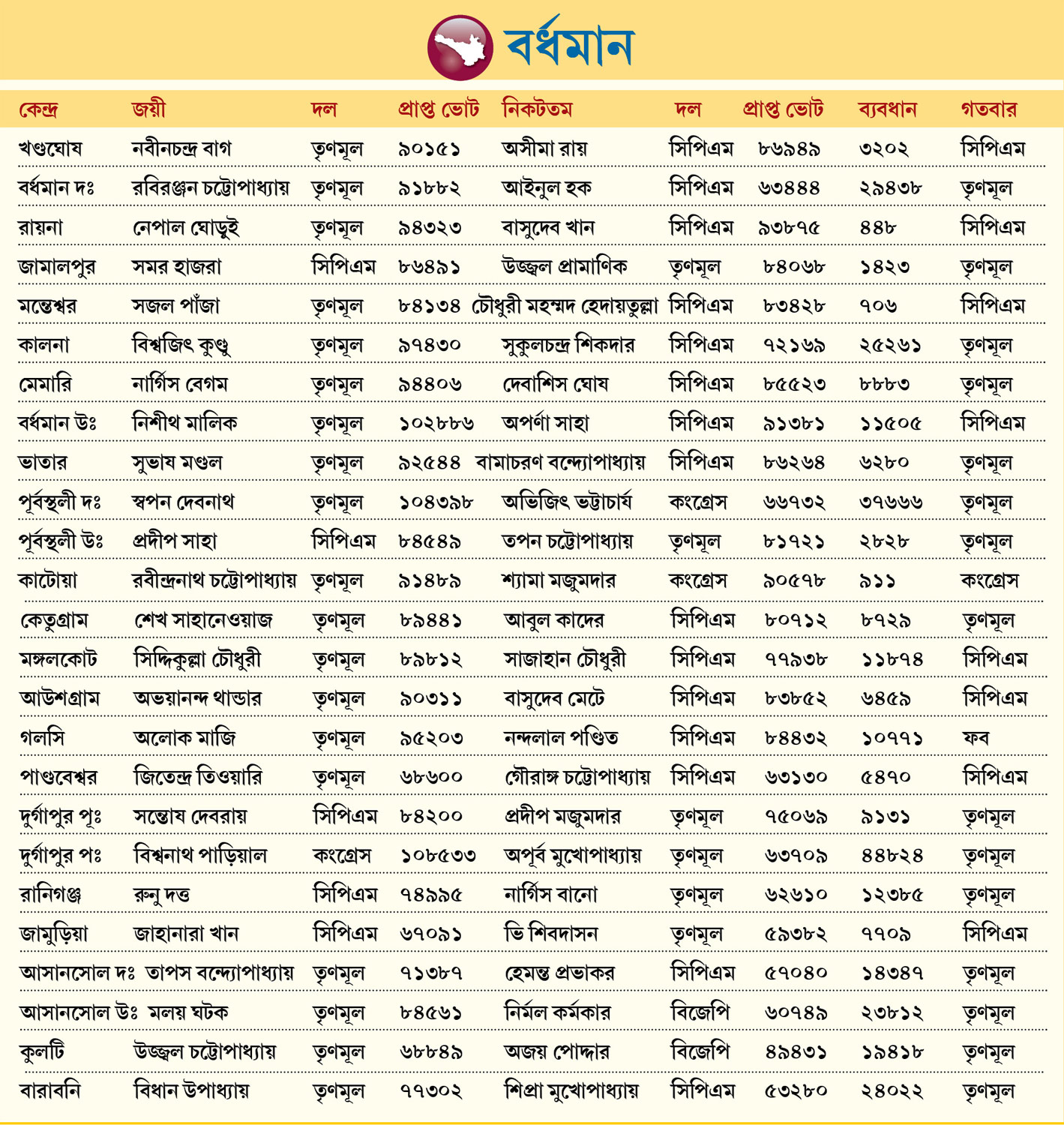 গত বার পরিবর্তনের হাওয়ার মাঝেও দখলে রাখা মন্তেশ্বর, গলসি, আউশগ্রাম, বর্ধমান উত্তর, খণ্ডঘোষ, রায়না, মঙ্গলকোট ও পাণ্ডবেশ্বর এ বার হাতছাড়া হল বামেদের। কাটোয়ায় আগের বার জিতেছিল কংগ্রেস। সে বারের জয়ী রবীন্দ্রনাথ চট্টোপাধ্যায় এ বার জিতলেন তৃণমূলের টিকিটে। আউশগ্রাম প্রায় ৪৯ বছর ও মন্তেশ্বর প্রায় ৩৯ বছর পরে হাতছাড়া হল বামেদের। তবে উলটপুরাণ হয়েছে পাঁচ কেন্দ্রে— জামালপুর, পূর্বস্থলী উত্তর, দুর্গাপুর পূর্ব ও পশ্চিম এবং রানিগঞ্জে। এই আসনগুলি তৃণমূলের হাত থেকে ছিনিয়ে নিয়েছে জোট। কিছু কেন্দ্রে আবার লড়াই হয়েছে হাড্ডাহাড্ডি। রায়না, কাটোয়া ও মন্তেশ্বরে জোট প্রার্থীরা হেরেছেন হাজারেরও কম ভোটে। বর্ধমান দক্ষিণে রবিরঞ্জন চট্টোপাধ্যায়, কালনায় বিশ্বজিৎ কুণ্ডু, পূর্বস্থলী দক্ষিণে স্বপন দেবনাথ, আসানসোল উত্তরে মলয় ঘটকেরা জয় পেয়েছেন বড় ব্যবধানে। তবে সবচেয়ে বড় ব্যবধানে জিতেছেন এক জোট প্রার্থী— দুর্গাপুর পশ্চিমের বিশ্বনাথ পাড়িয়াল, যিনি ভোটের আগেই তৃণমূল ছেড়ে কংগ্রেসে যান। প্রায় ৪৪ হাজার ভোটে তিনি হারিয়েছেন দুর্গাপুরের মেয়র অপূর্ব মুখোপাধ্যায়কে।