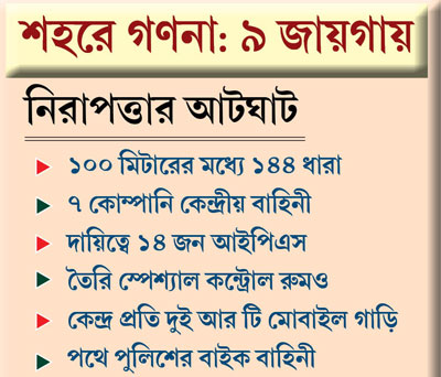 কলকাতার ন’টি জায়গায় গণনার জন্য সাত কোম্পানি কেন্দ্রীয় বাহিনী রাখা হচ্ছে। গণনা কেন্দ্রগুলির ১০০ মিটারের মধ্যে ১৪৪ ধারা জারি থাকবে। গণনা কেন্দ্রের বাইরে ত্রিস্তরীয় নিরাপত্তা বলয় তৈরি করা হবে বলে পুলিশ সূত্রে খবর। তবে যেখানে গণনা হবে, সেই জায়গায় ঢোকার অনুমতি নেই কলকাতা পুলিশের। সেখানে মোতায়ন থাকবেন কেন্দ্রীয় বাহিনীর জওয়ানেরা। গণনা কেন্দ্রের বাইরে ১০০ মিটারের মধ্যে রাজনৈতিক দলের এজেন্ট ছাড়া কাউকে ঢুকতে দেওয়া হবে না। সেখানে বাঁশের ব্যারিকেড করে আটকে দেওয়া হবে রাজনৈতিক দলের কর্মী-সমর্থকদের। গণনা কেন্দ্রের মূল গেটে মোতায়ন থাকবে বাহিনী। প্রতিটি গণনা কেন্দ্রের জন্য তৈরি করা হচ্ছে স্পেশ্যাল কন্ট্রোল রুম।