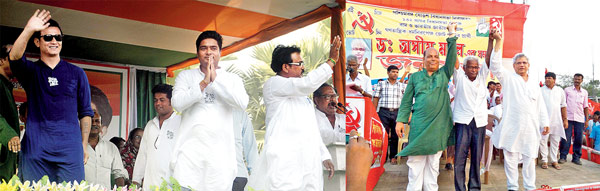 জয়নগরে অভিষেক বন্দ্যোপাধ্যায়। (ডান দিকে) নামখানায় সীতারাম ইয়েচুরি। ছবি: নির্মল বসু, শশাঙ্ক মণ্ডল।