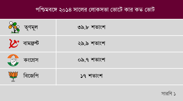 ২০১৪ সালে রাজ্যের ৪২টা লোকসভা আসনের মধ্যে তৃণমূল কংগ্রেস একাই পেয়েছিল ৩৪টা আসন (কাকতালীয় ভাবে বামফ্রন্টের ৩৪ বছরের শাসনের সঙ্গে সংখ্যাটা মিলে গেছে)। মোট আসনের ৭৭ শতাংশ ছিল তৃণমূলের দখলে। কিন্তু মোট প্রাপ্ত ভোটের অঙ্কটা রাজ্যের ক্ষমতাসীন দলের পক্ষে আদৌ উল্লসিত হওয়ার মতো নয়।
