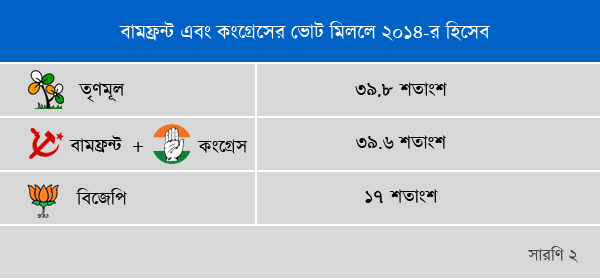 অর্থাত্ বামফ্রন্ট আর কংগ্রেস আলাদা লড়ে যেখানে মোট ৫৬টা বিধানসভা আসনে এগিয়েছিল, সেটাই এক সঙ্গে লড়লে ৯৮টা হতে পারত। তৃণমূল আর বিজেপির এক যোগে চূড়ান্ত সাফল্যের সময়েও।