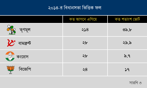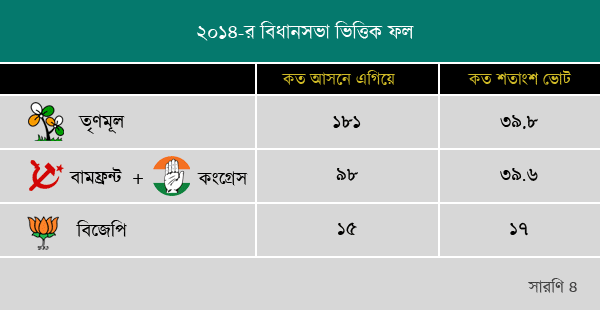 তৃণমূল আর বাম-কংগ্রেসের যৌথ ভোট ছিল প্রায় সমান সমান। দুপক্ষের ঝুলিতেই প্রায় ৪০ শতাংশ। বাকি রইল বিজেপির হাতে থাকা ১৭ শতাংশ ভোট যা আসলে এ বারের বিধানসভা নির্বাচনে একটা অতি গুরুত্বপূর্ণ ফ্যাক্টর হতে যাচ্ছে। অনেক বিশেষজ্ঞই বলছেন, বিজেপির ভোট এ বার অনেকটা কমবে, এবং সেই ভোট বেশিটাই পড়বে অন্যান্য বিরোধী দলের পক্ষে।
