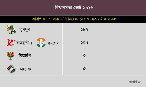 ভোটের দিন ক্ষণ ঘোষণার আগেই জনমত সমীক্ষা করেছিল এপিবি আনন্দ এবং এসি নিয়েলসন। আরও কয়েক দফায় এই সমীক্ষা চলবে। প্রথম সমীক্ষা যে হিসেব দিচ্ছে তাতে তৃণমূল জিতলেও ১০০র বেশি আসন পাবে বিরোধী জোট।