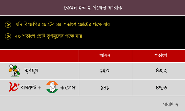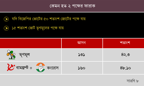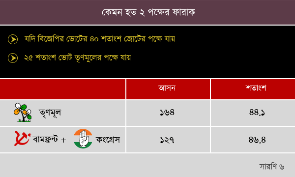 এ বার বিজেপির ভোটের হিসেবটায় আসা যাক। এটাই আগামী বিধানসভা ভোটে বড় ফ্যাক্টর হয়ে উঠতে যাচ্ছে। সোজা হিসেবে বোঝা যাচ্ছে, বিজেপির থেকে বেরিয়ে যাওয়া ভোট যদি প্রায় সমানে সমানে শাসক এবং প্রধান বিরোধী শিবিরে ঢোকে তবে বামফ্রন্ট-কংগ্রেস জোট হলেও তৃণমূল ভাল ভাবে জিতবে। কিন্তু না হলে? না হলে কিন্তু হিসেবটা তৃণমূলের পক্ষে স্বস্তির নয় একেবারেই।