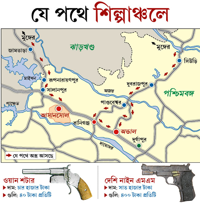কোথা থেকে আসে এই সব অস্ত্র? শম্ভুরা জানায়, বিহারের গয়া, ঝাড়খণ্ডের জামতাড়া ও মিহিজাম থেকে আসে ওয়ান শটার। নাইন এমএম আসে বিহারের মুঙ্গের থেকে। ঝাড়খণ্ড হয়ে বারাবনি, সালানপুর, রূপনারায়ণপুর দিয়ে ঢুকে পড়ে এ রাজ্যে। কিছু অস্ত্র বীরভূম হয়ে অজয়ের পাণ্ডবেশ্বর ঘাট পেরিয়ে দুর্গাপুর-অন্ডাল পৌঁছে যায়। অন্য সময়ে ট্রেনে বা বাসের ছাদে চাল-গমের বস্তায় ভরে বা খড়ের লরির মধ্যে আনা হয়। কিন্তু ভোটের আগে নজরদারির কড়াকড়ি থাকায় সে ঝুঁকি নেওয়া হয় না। ঝাড়খণ্ডের দিক থেকে কয়লার বস্তায় ভরে পিঠে নিয়ে বা সাইকেলে চাপিয়ে পাচার করা হয়। রূপনারায়ণপুর স্টেশন থেকে খানিকটা দূরের ফাঁকা এলাকা বা অজয়ের ঘাট পেরিয়ে সালানপুর-বারাবনির কিছু গ্রামের নির্জন রাস্তা ধরে এখন আনা-নেওয়া চলছে।