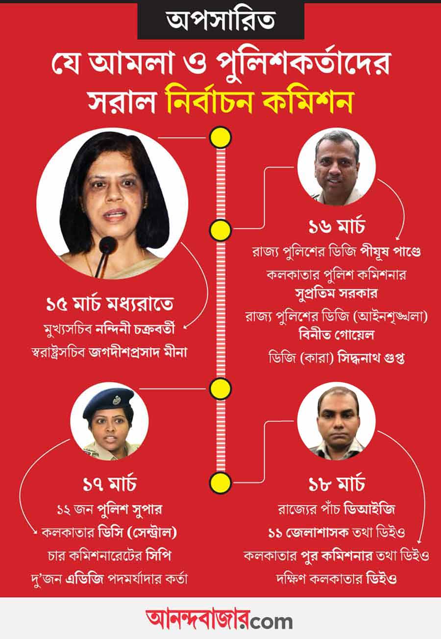 কলকাতা পুলিশের ডিসি (সেন্ট্রাল) পদ থেকে সরিয়ে দেওয়া হয়েছিল ইন্দিরা মুখোপাধ্যায়কে। তাঁকে পাঠানো হয়েছে রাজ্য পুলিশের গোয়েন্দা বিভাগের (সিআইডি) স্পেশাল সুপারিন্টেন্ডেন্ট (এসএস) পদে। এ ছাড়া, এডিজি (দক্ষিণবঙ্গ) পদ থেকে অপসারিত রাজীব মিশ্রকে পাঠানো হয়েছে এডিজি (সংস্কার ও সমন্বয়) করে। ব্যারাকপুরের পুলিশ কমিশনার ছিলেন প্রবীণকুমার ত্রিপাঠী। তাঁকে রাজ্য পুলিশের এসটিএফ-এর আইজি করা হয়েছে। একই দায়িত্ব পেয়েছেন আসানসোল-দুর্গাপুরের অপসারিত পুলিশ কমিশনার সুনীল কুমার চৌধরিকে। আইজি (উত্তরবঙ্গ) পদ থেকে অপসারিত সুকেশকুমার জৈনকে রাজ্য পুলিশের ইন্টেলিজেন্স ব্যুরোর (আইবি) আইজি করা হয়েছে। আইবির ডিআইজি হচ্ছেন হাওড়ার অপসারিত পুলিশ কমিশনার আকাশ মাঘারিয়া এবং চন্দননগরের অপসারিত পুলিশ কমিশনার কোটেশ্বর রাওকে।