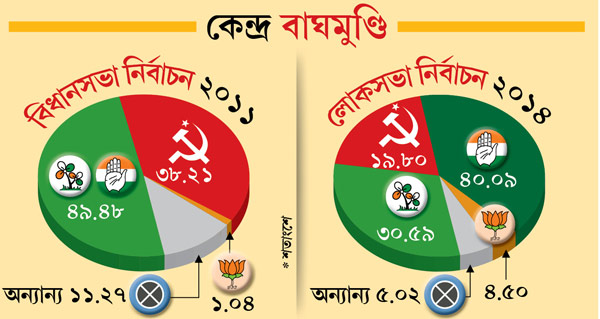 ভোটে জেতা নিয়ে এত নিসংশয়? ফের হাসলেন নেপালবাবু। প্রথম দিকে তৃণমূলের যুবরাজ অভিষেক বন্দ্যোপাধ্যায়ের এই কেন্দ্র নিয়ে ঝাঁপিয়ে পড়া মনোভাবে কিছু সংশয় দেখা দিয়েছিল কংগ্রেস কর্মীদের মনে। কিন্তু ভোটের মুখে বামেদের সঙ্গে জোট হওয়ায় সব দুশ্চিন্তা উড়ে গিয়ে জয়ের ব্যাপারে তাঁরা অনেকটাই নিশ্চিত বলে দাবি করছেন নেপাল ঘনিষ্ঠেরা। গত লোকসভা নির্বাচনের অঙ্কই নেপাল-শিবিরকে স্বস্তি দিচ্ছে। হবে নাই বা কেন? ওই নির্বাচনে বাম ভোটের সঙ্গে কংগ্রেসের মোট প্রাপ্তি যে তৃণমূলের দ্বিগুণ!