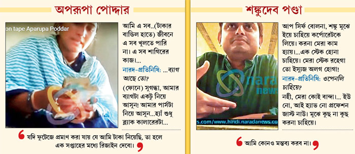 অপরূপার সঙ্গে অবশ্য গত লোকসভা ভোটের আগে অনায়াসেই দেখা করা গিয়েছিল বলে দাবি নারদ নিউজের। ফুটেজে দেখা যাচ্ছে, অপরূপা নীল চুড়িদার পরে খাটের ওপর বাবু হয়ে বসে রয়েছেন। গায়ে ডোরাকাটা টারকোয়াইজ রঙের ওড়না। সামনে রাখা টাকার তোড়া। মুখে হাসি ঝুলিয়ে বলছেন, ‘‘আমি জীবনে এ সব খুলতে পারি না। এ সব শাগিরের কাজ।’’ নারদ নিউজের প্রতিনিধিকে তখন বলতে শোনা যায়, ‘‘ঠিক হ্যায়। দো লাখ দে দো। এক লাখ ম্যায় আপকো দুঙ্গা। ব্যাগ আছে তো আপনার?’’ অপরূপা তখন ফোনে কাউকে বলেন, ‘‘সুগন্ধা আমার ব্যাগটা একটু নিয়ে আসুন। আমার পার্সটা... হ্যাঁ শুধু ব্ল্যাক কালারেরটা।’’
