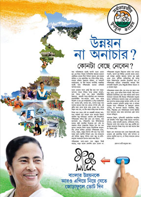 ‘আর খানিকক্ষণের মধ্যেই আপনি রওনা দেবেন বুথের দিকে। নিজের সাংবিধানিক ক্ষমতার প্রয়োগে একটিমাত্র বোতাম টিপে নির্ধারণ করবেন এই রাজ্যের ভবিষ্যত্।’ তৃণমূলের এই বিজ্ঞাপন দেখে চোখ কপালে ওঠার জোগাড় হয় বিরোধীদের। ভোটের সকালে এমন বিজ্ঞাপন প্রকাশিত হল কী ভাবে? যেখানে প্রথম কয়েকটি বাক্য পরেই লেখা হয়েছে, ‘আক্ষরিক অর্থেই আজ পশ্চিমবঙ্গের বাগ্যের চাবিকাঠি আপনার হাতে।’ নির্বাচন কমিশনের নিয়ম অনুযায়ী, তাদের আগাম অনুমতি ছাড়া সংবাদ মাধ্যমে কোনও বিজ্ঞাপনই প্রকাশ করা যায় না। এমনকী, ভোটের দিন এ ভাবে ভোট প্রার্থনার আবেদনও জানানো যায় না বলে অভিযোগ বিরোধীদের। সিপিএমের রাজ্য সম্পাদক সূর্যকান্ত মিশ্রের অভিযোগ, ‘‘এতে নির্বাচনী আচরণবিধি ভঙ্গ হয়েছে। আমরা দিল্লিতে নির্বাচন সদনে অভিযোগ জানাব।’’ প্রদেশ কংগ্রেস সভাপতি অধীর চৌধুরীও একই অভিযোগ করেছেন। তাঁর কথায়, ‘‘স্পষ্টতই এটি আচরণবিধি ভঙ্গের ঘটনা। আমরা কমিশনের কাছে অভিযোগ জানাব।’’