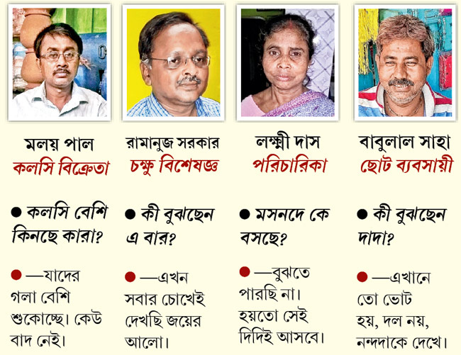 এতটা খারাপ অবস্থা না হলেও গোটা তল্লাট এখন অনেকটাই ভোট-জ্বরে কাবু। লোকাল ট্রেনের ভিড়ে ঠাসা কামরা থেকে নাটমন্দিরে কথকতার আসর—চর্চার বিরাম নেই। এবং এঁদের অমেকেই ফের বদলের গন্ধ পাচ্ছেন। স্টেশনে হাঁটতে-হাঁটতে তৃণমুলের ক্ষমতায় আসার সম্ভাবনা যেমন স্রেফ নাকচ করে দিলেন সেচ দফতরের প্রাক্তন কর্মী সুকুমার বারিক— “ধুর মশাই! পঞ্চাশ শতাংশ ডিএ বাকি রেখে কেউ ভোটে জিততে পারে! তবে ওরা সূর্যকান্তকে জিততে দেবে না। মুখ্যমন্ত্রী হবেন অধীর।”