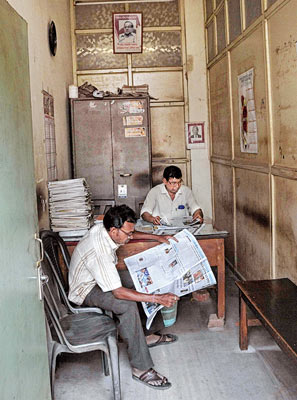 খবরে চোখ। সিউড়িতে সিপিএম পার্টি অফিসে। —নিজস্ব চিত্র