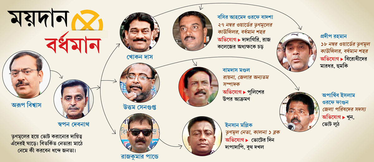 আর আছেন অনুব্রত মণ্ডল। তৃণমূলের বীরভূম জেলা সভাপতি কেতুগ্রাম, মঙ্গলকোট ও আউশগ্রামের দায়িত্বে। দলের নিচুতলা জানাচ্ছে, কেষ্টদা (অনুব্রতর ডাকনাম) পঞ্চায়েত সদস্য ও পুরসভার কাউন্সিলরদের বলে দিয়েছেন, নিজেদের এলাকায় ‘লিড’ দিতে না পারলে কপালে দুঃখ আছে। অভিযোগ, তার পরেই বুধবার কেতুগ্রামে সিপিএমের দুই এজেন্টকে মারধর, আউশগ্রামে হুমকি দেওয়া হয়। বর্ধমান দক্ষিণ, রায়না, খণ্ডঘোষে কয়েকজনের ভোটার কার্ড কেড়ে নেওয়া হয়েছে। মোটরবাইকে চড়ে ভোটারদের হুমকির অভিযোগে কেতুগ্রামে গ্রেফতার হন তৃণমূলের তিন কর্মী। মেমারি, মন্তেশ্বর, রায়নাতেও অশান্তি বেধেছে।