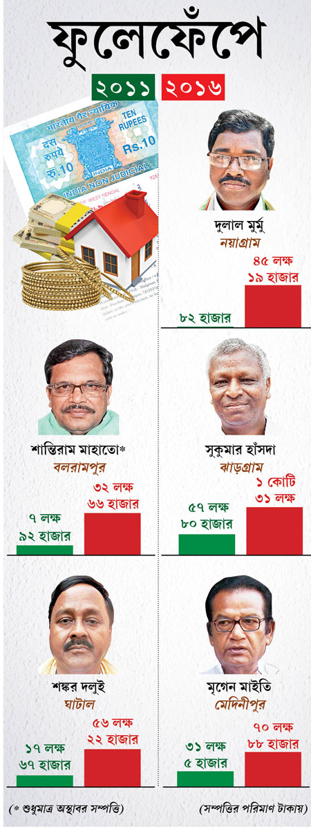 মাওবাদী-পর্বে লালগড়ে সিপিএম নেতা অনুজ পাণ্ডের দো’তলা বাড়ি ভেঙে গুঁড়িয়ে দিয়েছিল জনগণের কমিটির লোকজন। সেই জঙ্গলমহলে তৃণমূলের অন্যতম আদিবাসী মুখ সুকুমার হাঁসদা। পেশায় চিকিৎসক সুকুমারবাবু আদিবাসী উন্নয়নমন্ত্রীও ছিলেন। ২০১১ সালে তাঁর স্থাবর-অস্থাবর সম্পত্তির পরিমাণ ছিল ৫৭ লক্ষ ৮০ হাজার ২৭১ টাকা। আর এ বারের হলফনামা অনুযায়ী, সুকুমারবাবুর সম্পত্তির পরিমাণ ১ কোটি ৩১ লক্ষ ২৪ হাজার ৭১০ টাকা। ঝাড়গ্রাম শহরে সুকুমারবাবুর বাড়ির অন্দরমহলের ভোলও পাল্টে গিয়েছে। দামি মার্বেল বসেছে, এসেছে মূল্যবান আসবাব। দুবরাজপুরে জমিও কিনেছেন ডাক্তারবাবু। আর এক মন্ত্রী পুরুলিয়ার বলরামপুরের শান্তিরাম মাহাতোর আবার পাঁচ বছরে অস্থাবর সম্পত্তি চার গুণেরও বেশি বেড়েছে। ২০১১-সালে ৭ লক্ষ ৯২ হাজার ২২৪ টাকার অস্থাবর সম্পত্তি ছিল। এ বার অঙ্কটা দাঁড়িয়েছে ৩২ লক্ষ ৬৬ হাজার ২১১ টাকা।