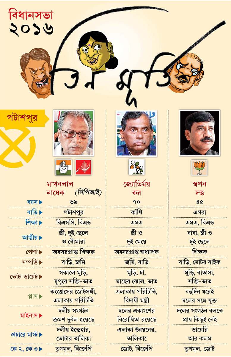 ২০১১ সালের মত এবারও পটাশপুর বিধানসভা কেন্দ্রে তৃণমূল প্রার্থী হয়েছেন জ্যোতির্ময় কর আর বিরোধী বাম-কংগ্রেস জোট প্রার্থী হয়েছেন সিপিআইয়ের জেলা সম্পাদকমণ্ডলীর সদস্য মাখনলাল নায়েক। মাখনলালবাবুর অভিযোগ, ‘‘তৃণমূলের সন্ত্রাসের জেরে বিরোধী রাজনৈতিকগুলি কোনও কর্মসূচি পালন করতে পারেনি। দলীয় কার্যালয় বন্ধ রাখা ছাড়াও সন্ত্রাসের কারণে অনেকেই ঘরছাড়া হয়ে বাইরে থাকতে বাধ্য হয়েছিল। নির্বাচনের আগে কিছু ঘড়ছাড়া মানুষ বাড়িতে ফিরলেও আতঙ্কে রয়েছে।’’