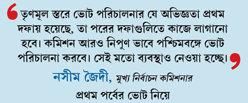 নিশ্চিন্ত ও নির্বিঘ্ন ভোটের আশ্বাস দিয়েছিলেন মুখ্য নির্বাচন কমিশনার নসীম জৈদী। সোমবার রাজ্যের প্রথম দফার ভোট দেখল, কয়েকটি বিক্ষিপ্ত ঘটনা ছাড়া মোটের উপর কথা রেখেছেন জৈদী। এই পর্বের ভোট নিয়ে শাসক যেমন খুশি, তেমন বিরোধীরাও অন্তত বুঝিয়েদিয়েছেন যে তাঁরা অসন্তুষ্ট নন। বাংলার ভোটচিত্রে যা কিছুটা বিরলই!