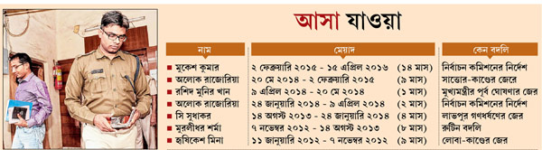 ঘটনা হল, স্বল্প সময়ের ব্যবধানে জেলায় পুলিশ সুপার বদলি হওয়ার এই রেওয়াজ অবশ্য বেশ কয়েক বছর ধরে সমানে চলছে। যার জেরে গত চার বছরে সাত-সাত বার পুলিশ সুপার বদল দেখেছে এই জেলা। কখনও সেই বদল হয়েছে রাজ্য সরকারের সিদ্ধান্তে। কখনও বা নির্বাচন কমিশনের নির্দেশে। মাত্র পাঁচ মাস দায়িত্বে থাকতে না থাকতেই জেলা পুলিশ সুপার সি সুধাকরকে বদলে অলোক রাজেরিয়াকে নিয়ে আসা হয়েছিল। সুধাকরের আগে মুরলীধর শর্মাকে সরিয়ে ফেলা হয় মাত্র আট মাসেই। লোবা-কাণ্ডের জেরে আবার সরানো হয়েছিল হৃষিকেশ মিনাকে। তারও আগে জেলার দায়িত্বে থাকা নিশাদ পারভেজ এবং রবীন্দ্রনাথ মুখোপাধ্যায়দের কার্যকালের মেয়াদও ছিল এগারো মাস করে।